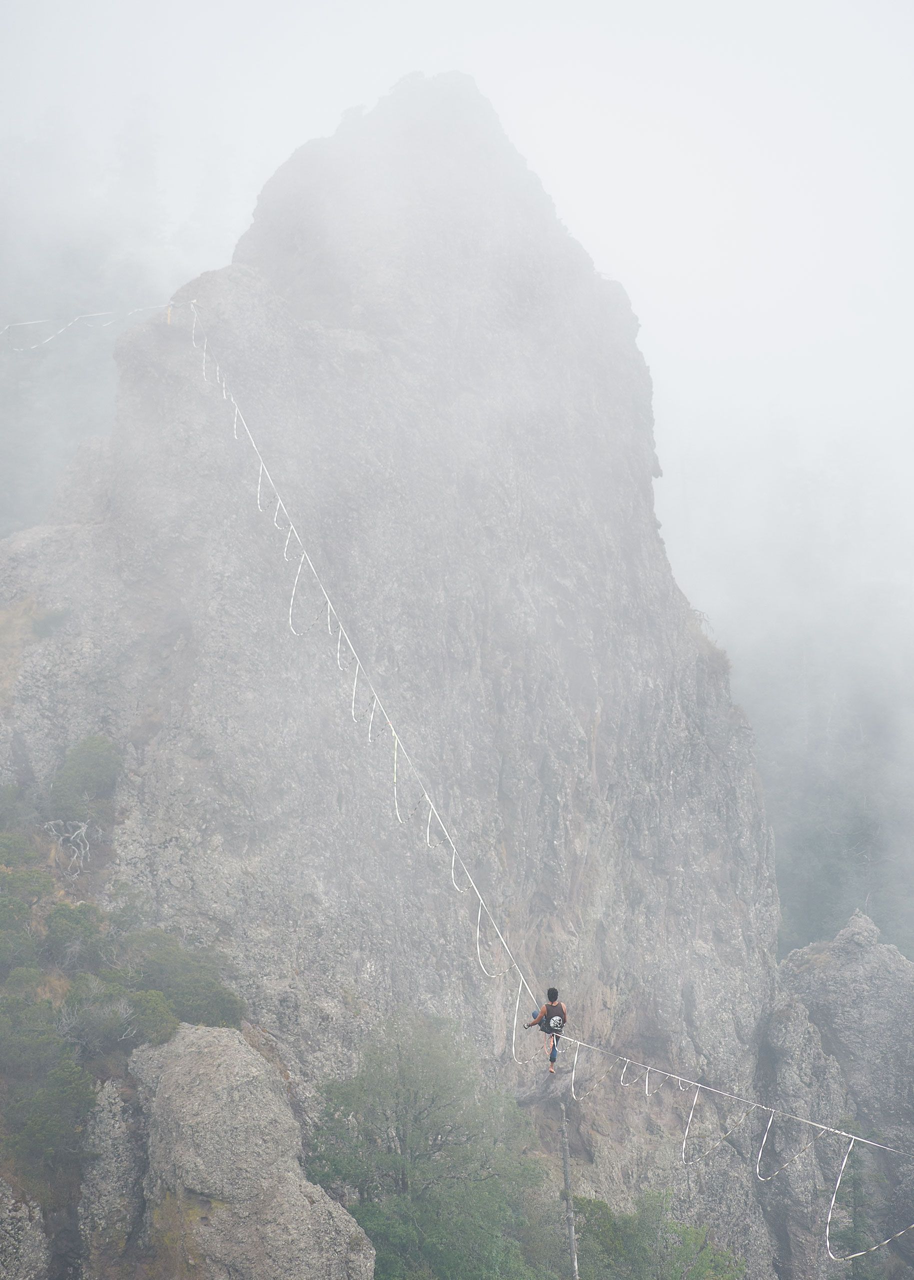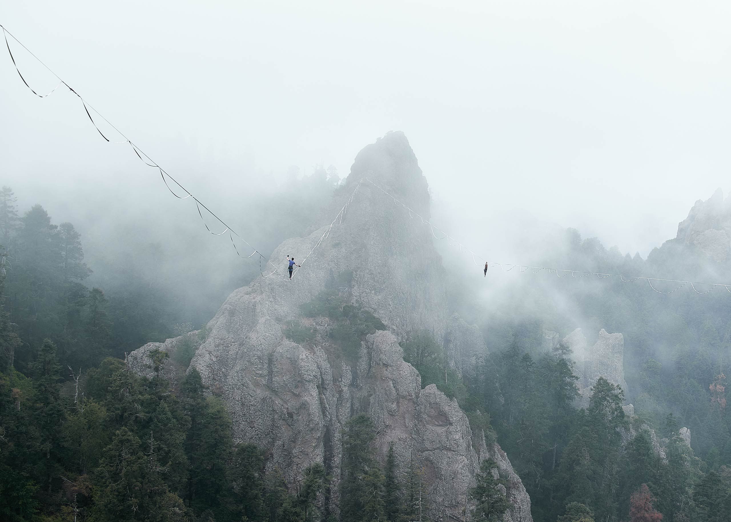 Wearing my harness and slings, I walked secured by the dangerous areas in order to look for new frames and athletes walking their lines. I was taking some picture to Amy, a new friend that was trying to walk her line when a huge cloud started to surrounding us. Just behind me the action was going on, 2 guys were trapped by this cloud and suddenly they disappeared. They started to celebrate with loudly screams this experience and I couldn’t believe what I have in my camera.